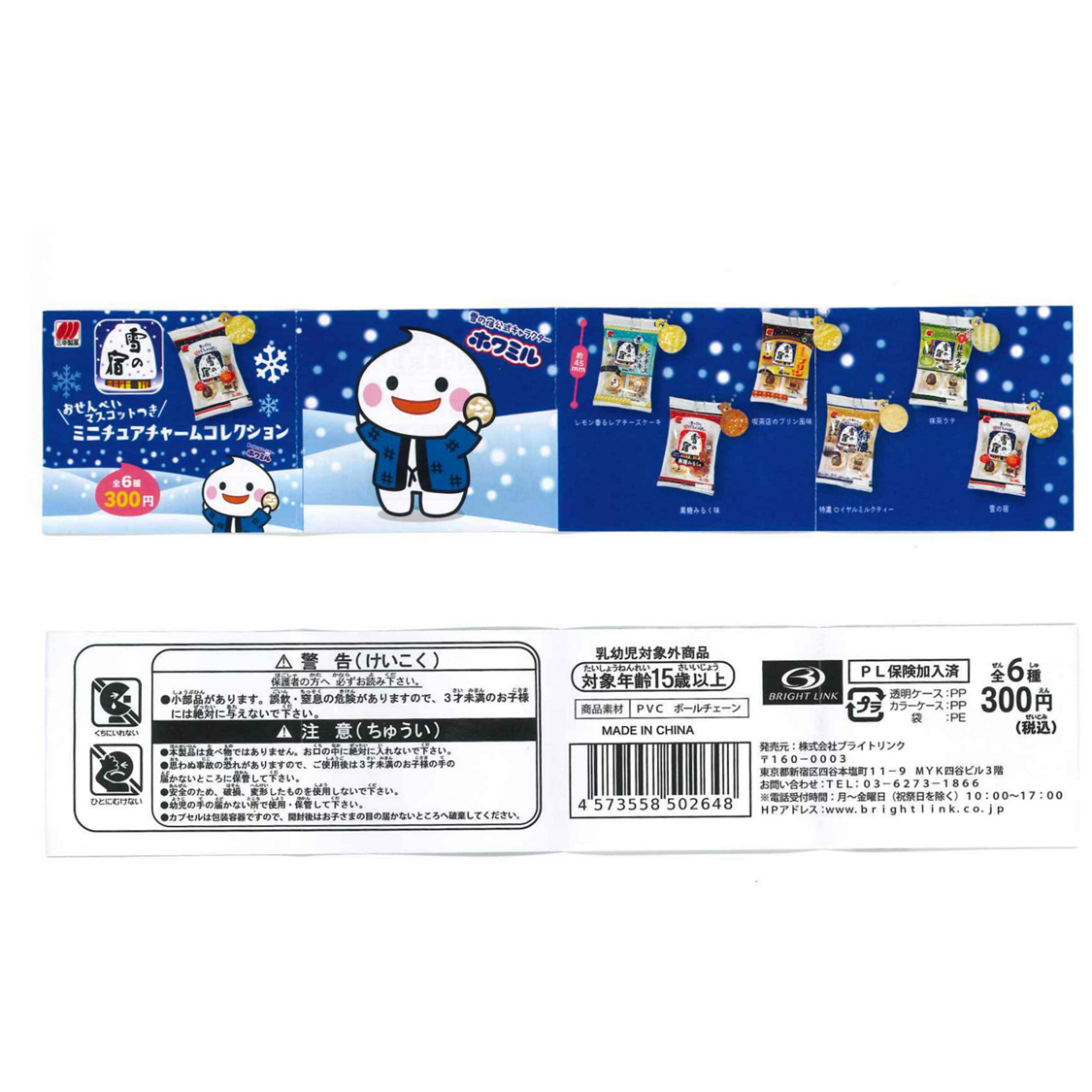本製品は「雪の宿」ブランドから過去に発売された商品を含むパッケージ全6種をデザインはほぼそのまま約45mmのミニチュアに再現したものです。各パッケージには「雪の宿」のおせんべいをモチーフとしたマスコットがついております。